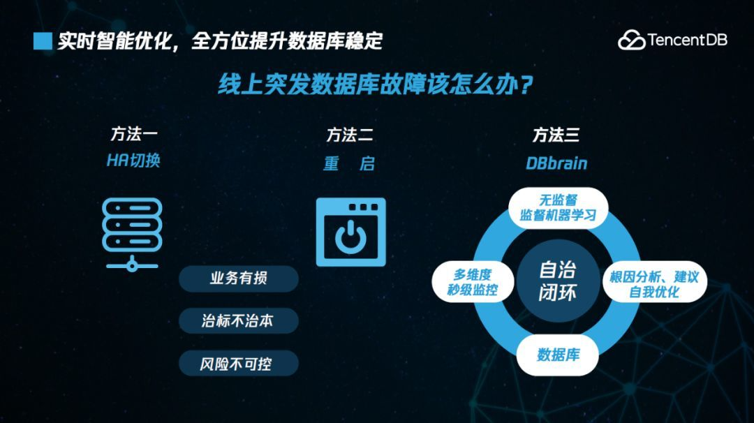 作为一款数据库智能诊断和优化产品,DBbrain为用户提供实时的性能诊断和安全防护,高效的帮助用户定位故障原因、优化建议、协助用户从源头进行预防,并通过AI调参能力,提升数据库整体性能。